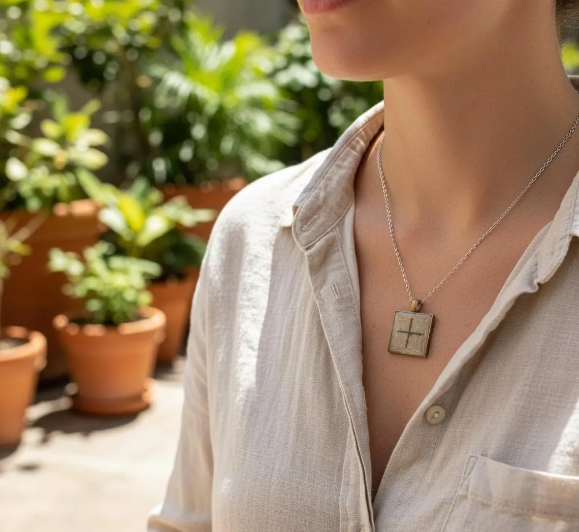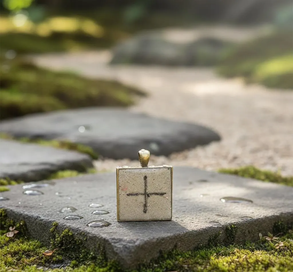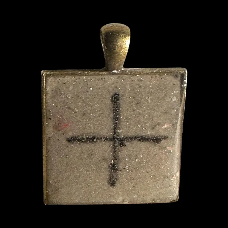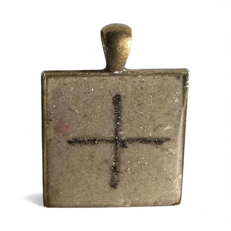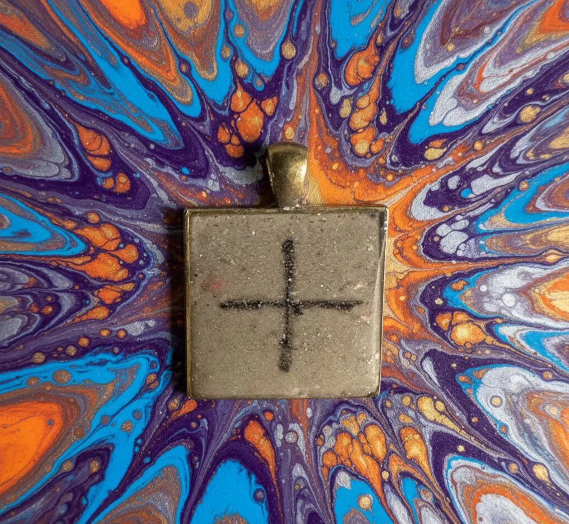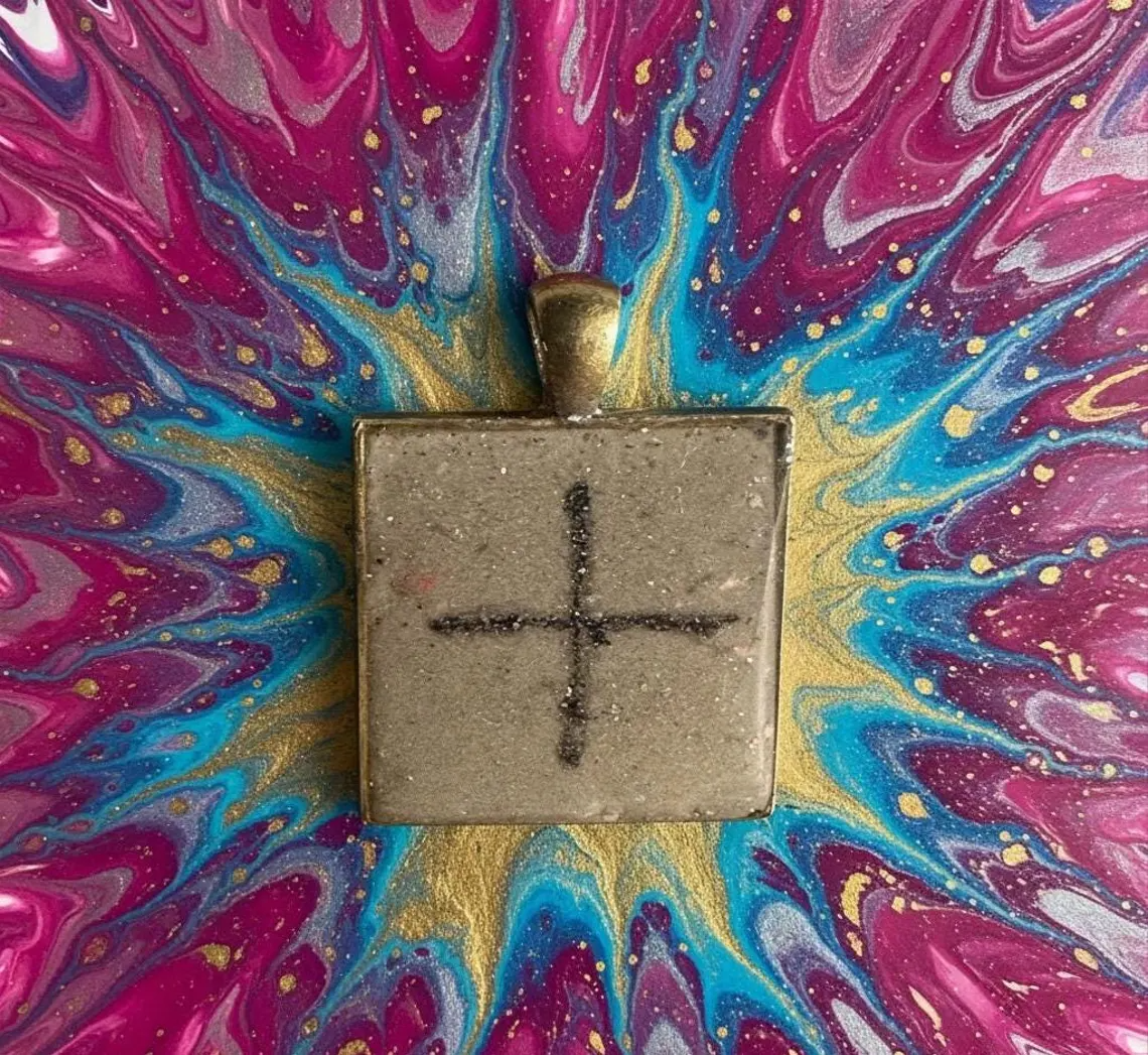 The square geometric shape honors sacred geometry principles while the centered cross represents the ultimate balance point where all energies meet in harmony. Sparkly concrete grounds the ancient wisdom in earth energy while alcohol ink adds artistic flair and passionate vitality. The glossy resin seal creates luminous depth that draws the eye inward to contemplate the symbol's meaning. Unlike mass-produced stamped symbols, each handmade pendant carries the energetic imprint of artisan creation, making it more than jewelry - it becomes a personal talisman.