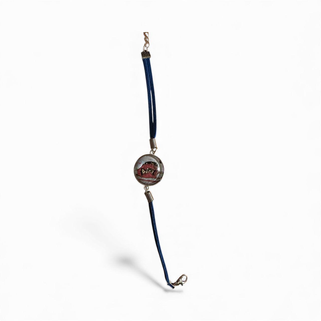 Embrace wearable art with this handmade resin bracelet featuring stunning gold leaf flakes and abstract red design! Crafted as an eco-friendly accessory using sustainable materials, this unique piece showcases luxe gold metallic accents swirling through vibrant red and neutral tones, creating museum-quality miniature art. The 1" round pendant is set in bronze-tone frame and attached to rich navy blue fabric cord with decorative wire coil accents, creating modern minimalist elegance. Perfect as a thoughtful gift idea for art lovers, contemporary style enthusiasts, or eco-conscious fashionistas. Ideal Christmas gift idea that combines luxury and sustainability! The adjustable 8.5" band fits most wrists comfortably—and creatively doubles as a stylish cat collar for fashion-forward feline friends! Each piece is handmade with unique gold leaf patterns, making yours truly one-of-a-kind artwork.