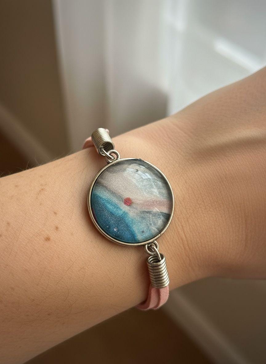 Experience where ocean meets sky with this handmade resin art bracelet featuring mesmerizing blue, teal, red, and pink swirls! Crafted as an eco-friendly accessory using sustainable materials, this unique piece captures the ethereal beauty of sunsets over water with shimmering turquoise, soft pink accents, and coral tones creating depth and dimension. The 1" round pendant is set in gold-tone frame and attached to beautiful coral pink fabric wrap with decorative wire coil accents, creating feminine bohemian elegance. Perfect as a thoughtful gift idea for ocean lovers, beach enthusiasts, or eco-conscious fashionistas. The adjustable 8.5" band fits most wrists comfortably—and creatively doubles as a stylish cat collar for fashion-forward feline friends! Each piece is handmade with unique swirl patterns, making yours truly one-of-a-kind.