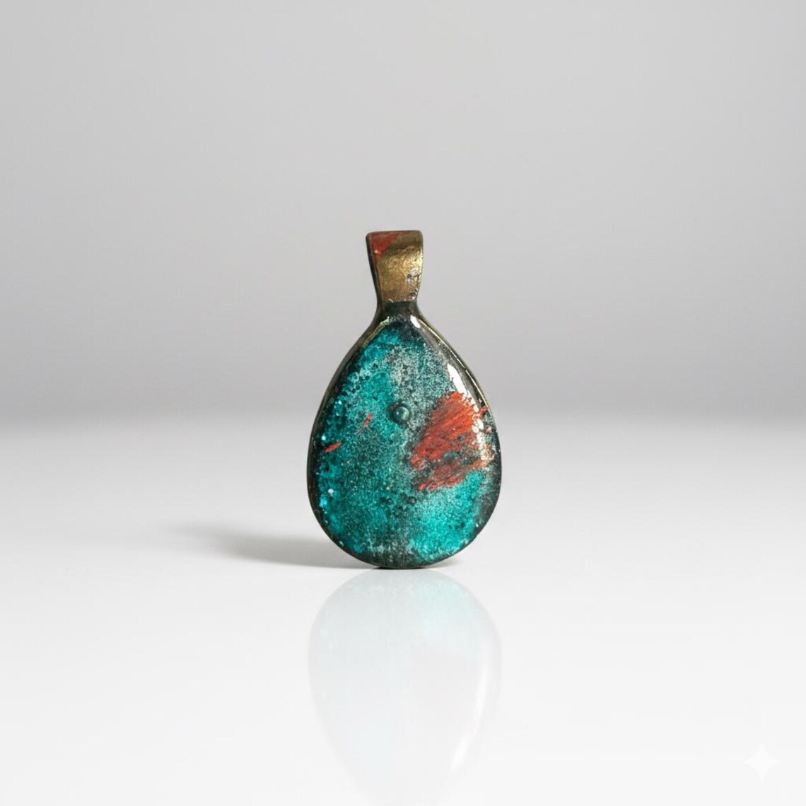 Material: Sparkly concrete with teal and copper alcohol ink art, sealed in glossy resin, bronze teardrop bezel