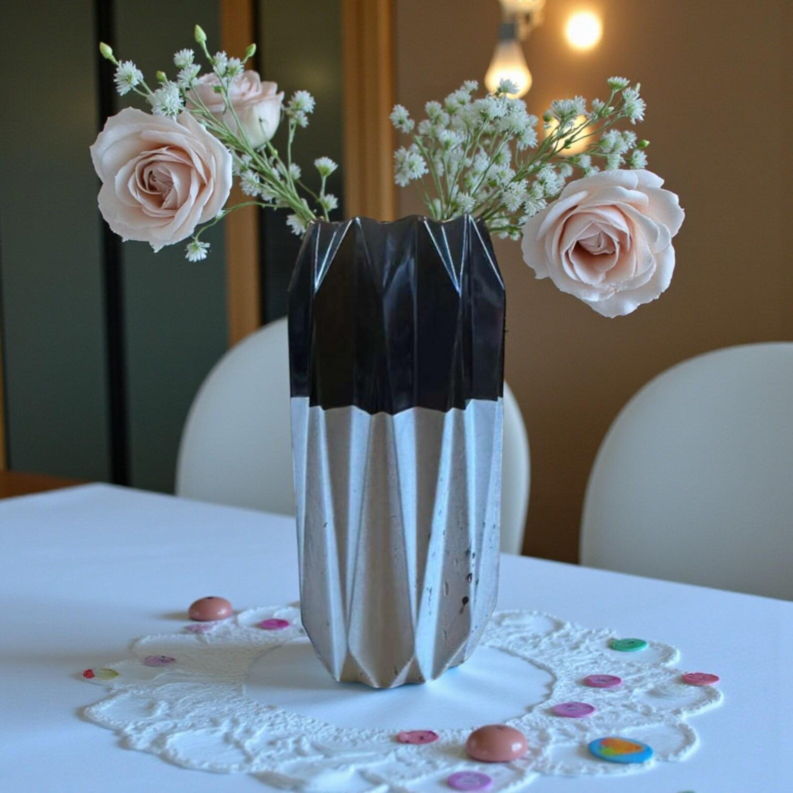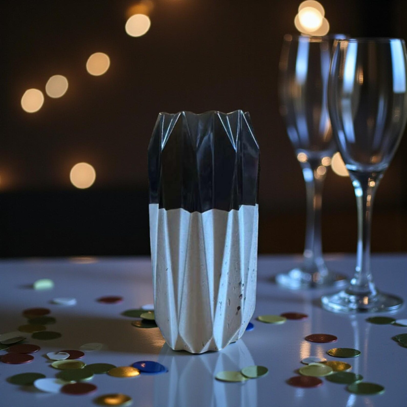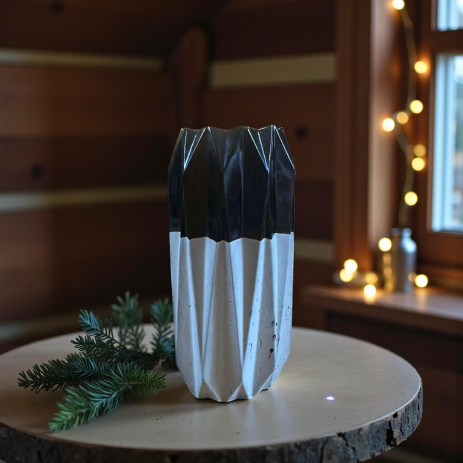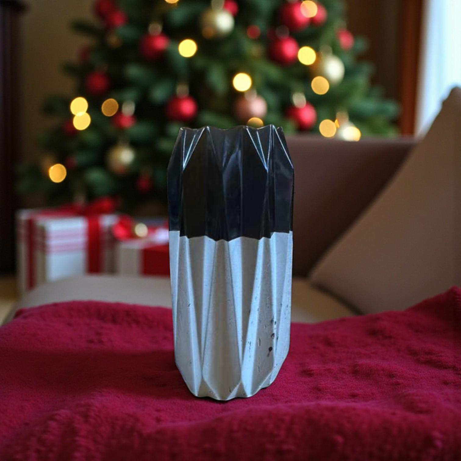 Transform your living space with this stunning handmade geometric candle holder that seamlessly blends glossy black resin with raw concrete texture. The dramatic two-tone color scheme creates bold visual contrast while the faceted architectural design adds sculptural dimension to any room. This versatile piece works beautifully as both a modern candle holder and contemporary vase, offering dual functionality for year-round styling flexibility. Whether you're creating ambient lighting with flickering tealights or displaying dried botanicals, this handcrafted accent piece delivers sophisticated urban elegance.