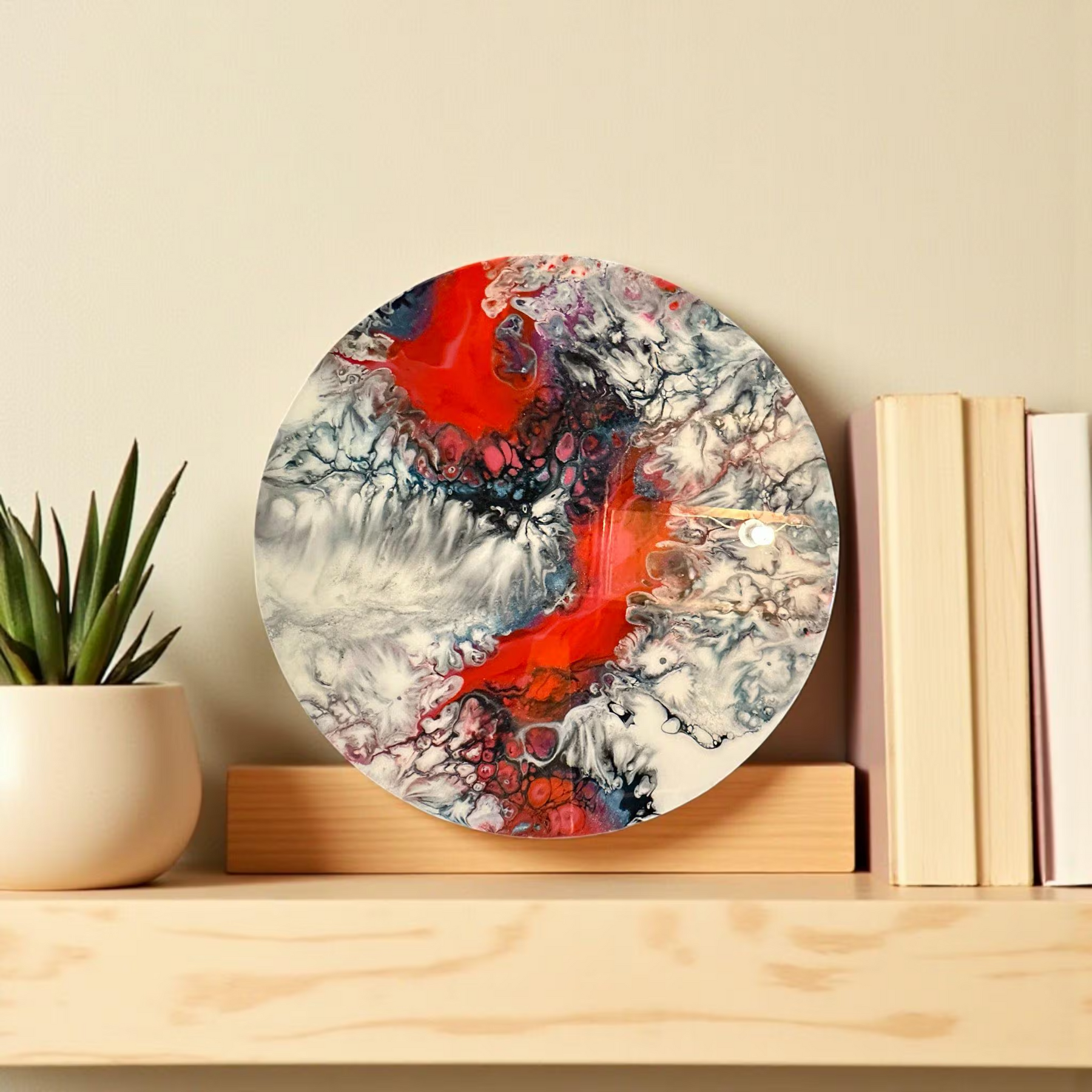 Fluid art represents movement, energy, and organic beauty—each piece captures a moment of creative flow frozen in time. The unpredictable nature of resin pouring creates patterns impossible to replicate, making every piece genuinely unique. The combination of coral-red (passion and energy), black (sophistication and drama), white (purity and balance), and blue-gray (calm and mystery) creates dynamic tension that's both exciting and harmonious. Glossy resin finish adds depth and dimension, creating luminous quality that changes with lighting!