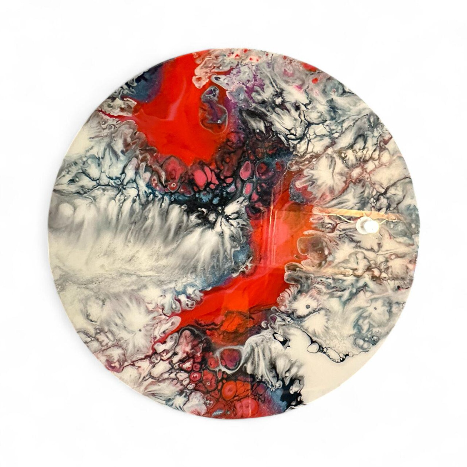 Transform your living space with this stunning handmade resin art table top featuring mesmerizing fluid art design with bold red, black, white, and blue-gray marble patterns! Crafted from premium eco-friendly resin with captivating organic swirls, cellular textures, and glossy finish, this versatile piece combines functional furniture with gallery-worthy abstract art. The dramatic color palette with vibrant coral-red focal point surrounded by inky black, crisp white, and smoky blue-gray creates striking visual impact perfect for modern living rooms, bedrooms, entryways, or anywhere needing artistic statement piece. The generous 17" circular diameter provides perfect coffee table topper size, spa tray, vanity display, or standalone wall art. Substantial at 3 lbs with sleek 1/4" profile. Each piece is handmade with unique pattern variations—truly one-of-a-kind functional art!