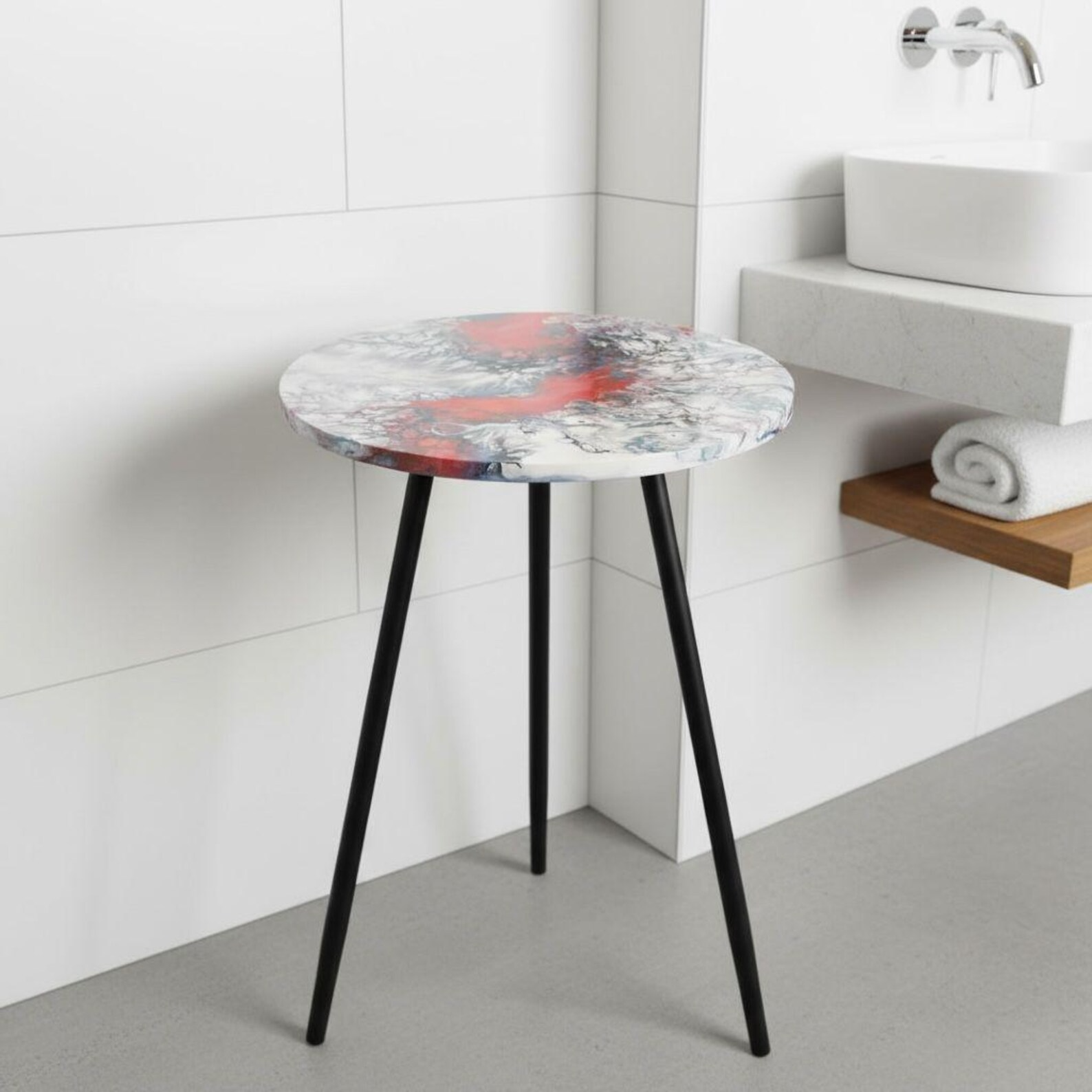 Ready to add gallery-worthy art to your home? This handmade resin art table top brings bold visual impact and versatile functionality to living rooms, bedrooms, bathrooms, and any space needing statement decor! Perfect as coffee table centerpiece, ottoman tray, vanity display, spa organizer, serving surface, or wall art installation. The mesmerizing fluid art patterns with coral-red, black, white, and blue-gray swirls create museum-quality appearance while the practical 17" diameter offers functional versatility. Unique, substantial, and conversation-starting—order now and own a truly one-of-a-kind functional art masterpiece!