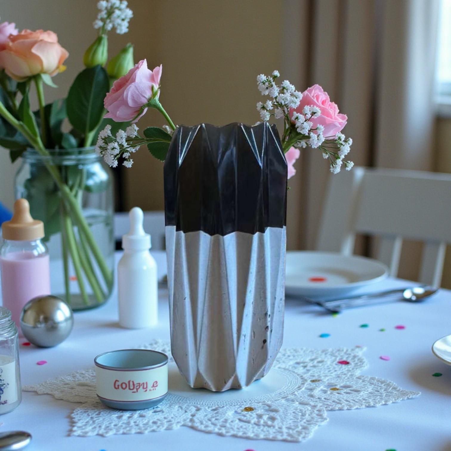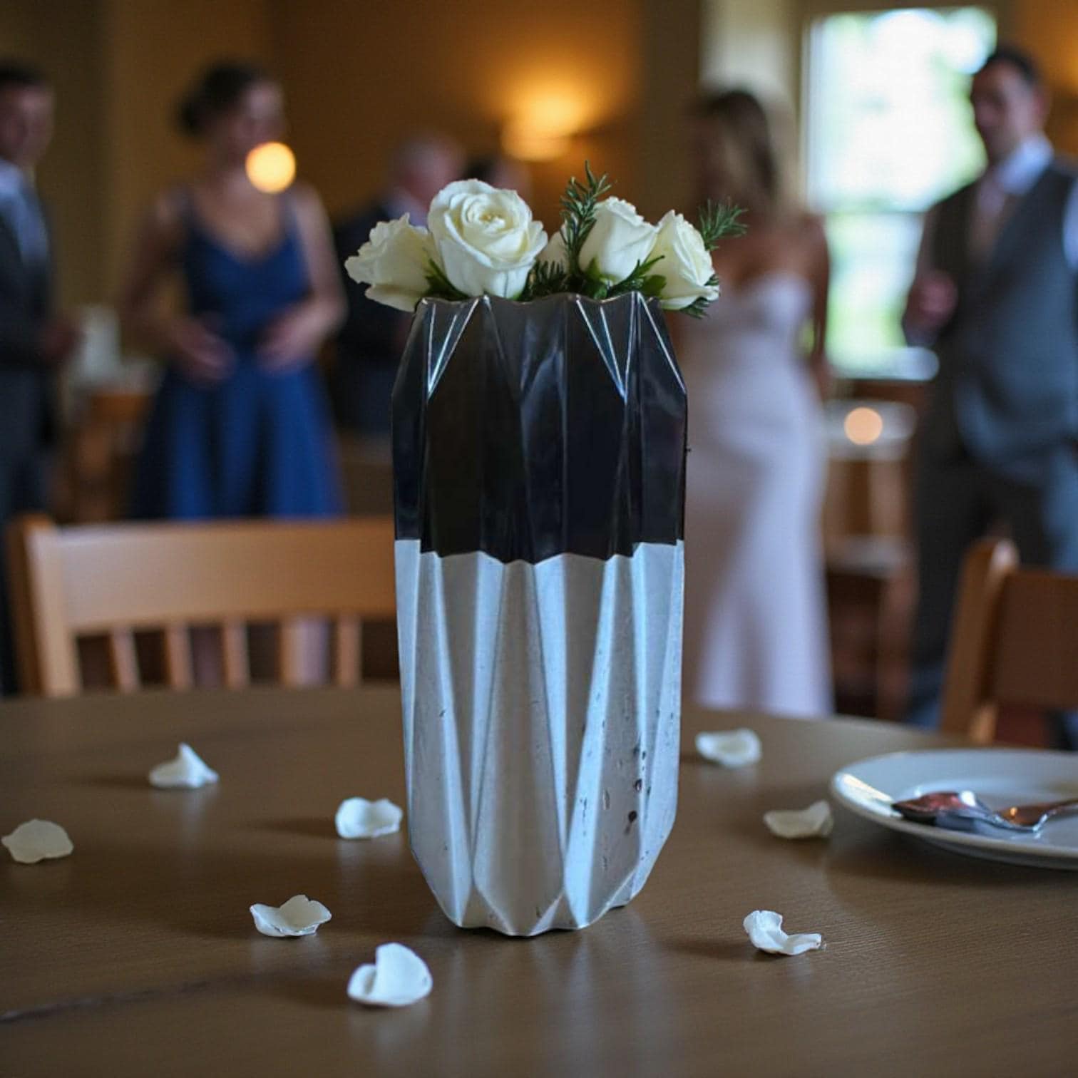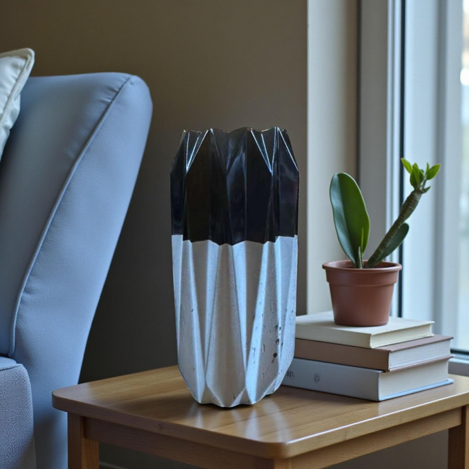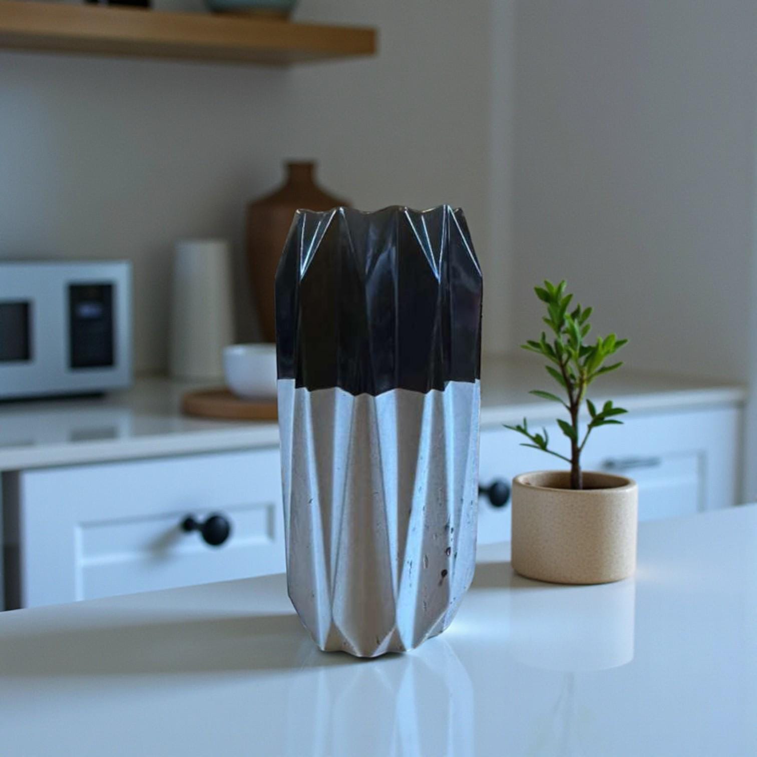 Transform your living space with this stunning handmade geometric candle holder that seamlessly blends glossy black resin with raw concrete texture. The dramatic two-tone color scheme creates bold visual contrast while the faceted architectural design adds sculptural dimension to any room. This versatile piece works beautifully as both a modern candle holder and contemporary vase, offering dual functionality for year-round styling flexibility. Whether you‘re creating ambient lighting with flickering tealights or displaying dried botanicals, this handcrafted accent piece delivers sophisticated urban elegance.