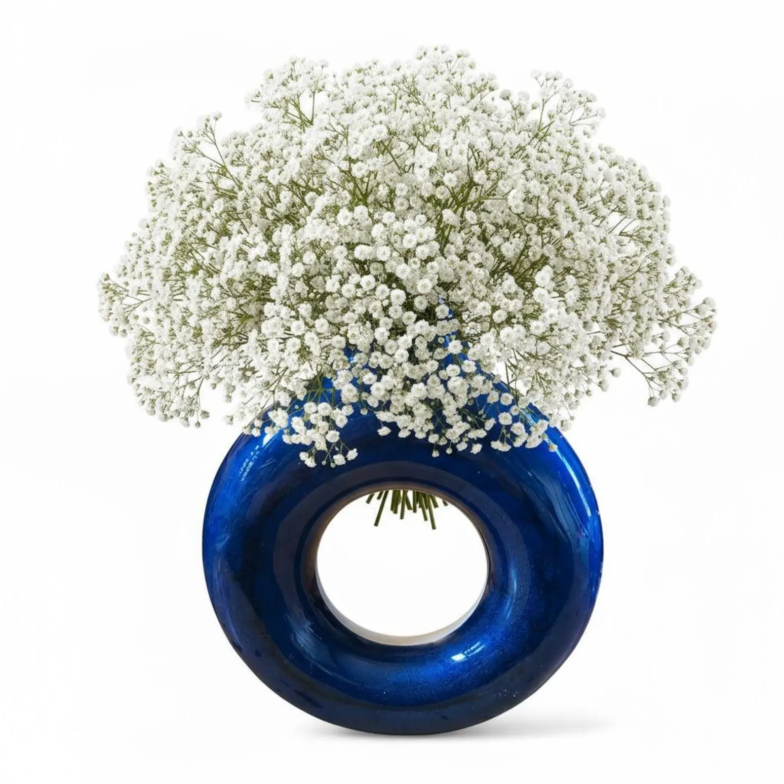 Display with a single statement stem like monstera leaf, bird of paradise, or protea for dramatic minimalist impact. Style with dried pampas grass, pampas plumes, or eucalyptus branches for bohemian texture. Place on a stack of coffee table books with a small crystal or geode beside it for curated styling. Create a vignette with multiple heights by pairing with taper candles in modern holders and small sculptural objects. Use as part of a monochromatic black and white display with ceramic pieces and natural wood accents. Position near a window where natural light can pass through the round hole opening, creating beautiful shadows and dimension throughout the day. For contemporary minimalist styling, let it stand alone on a floating shelf as a pure sculptural statement.
