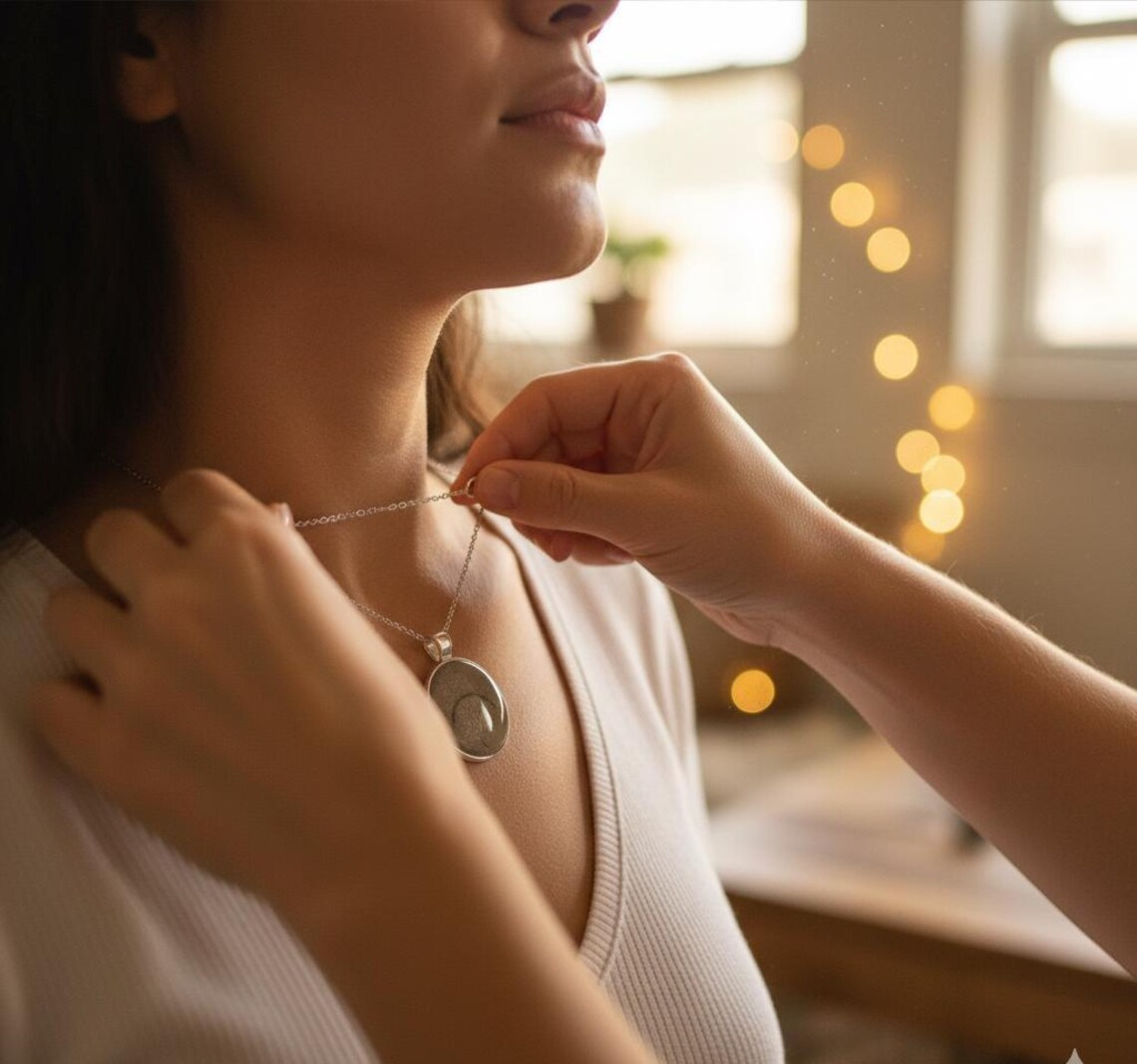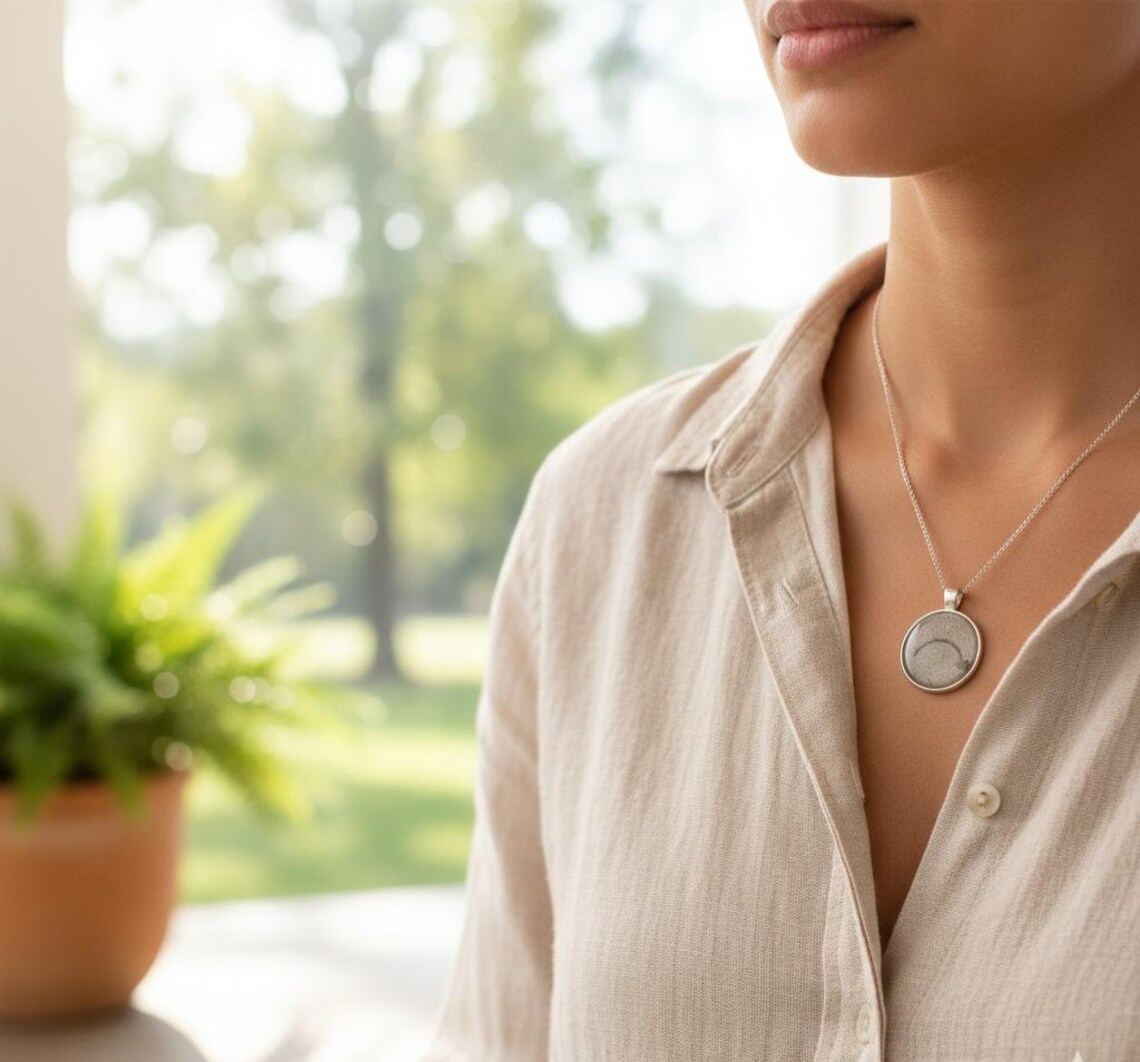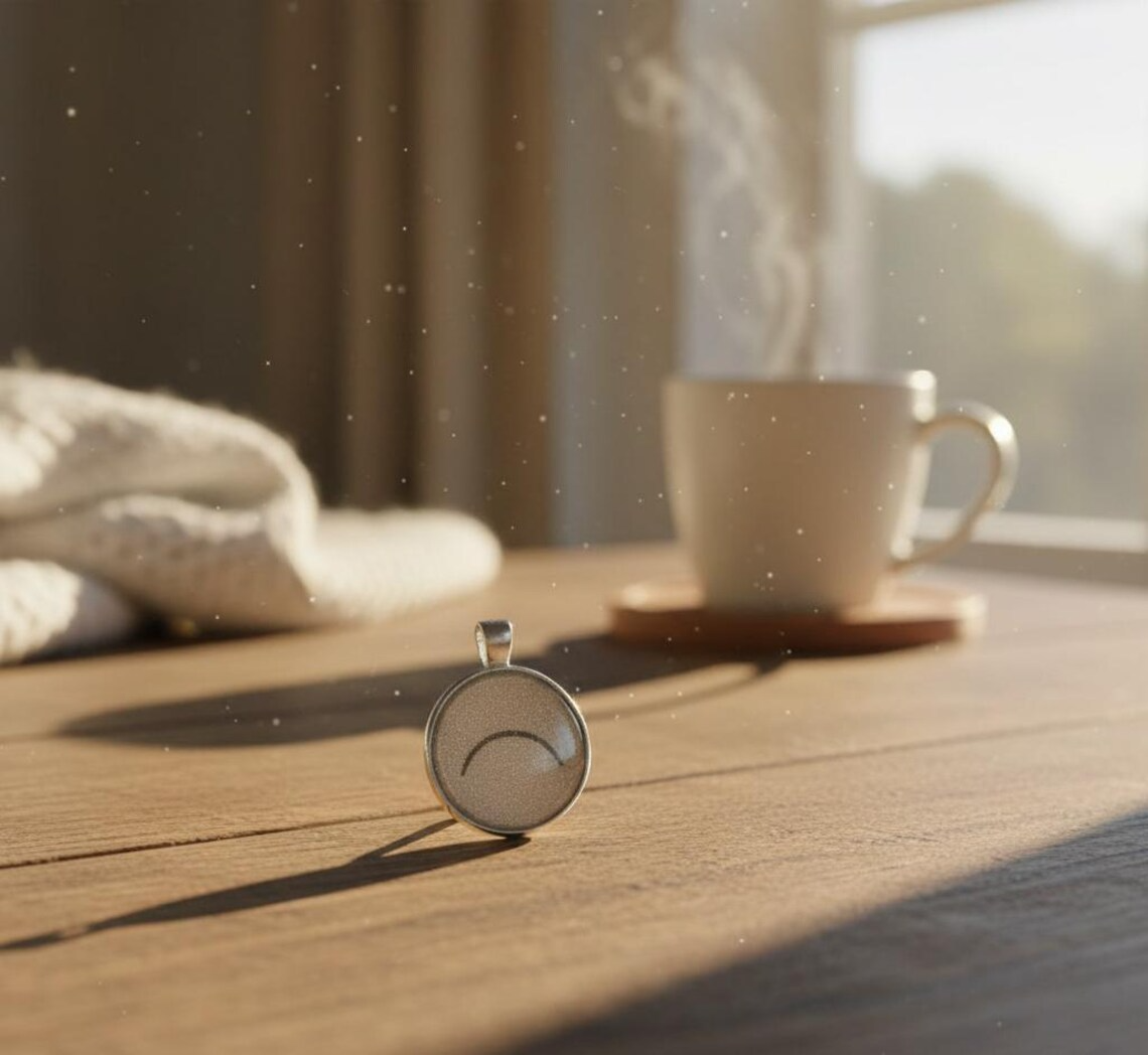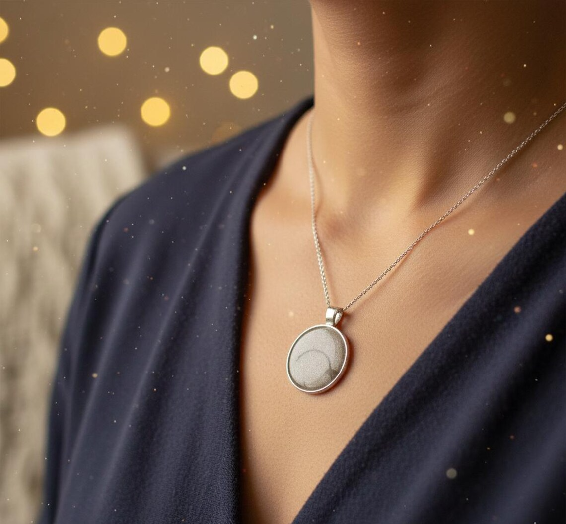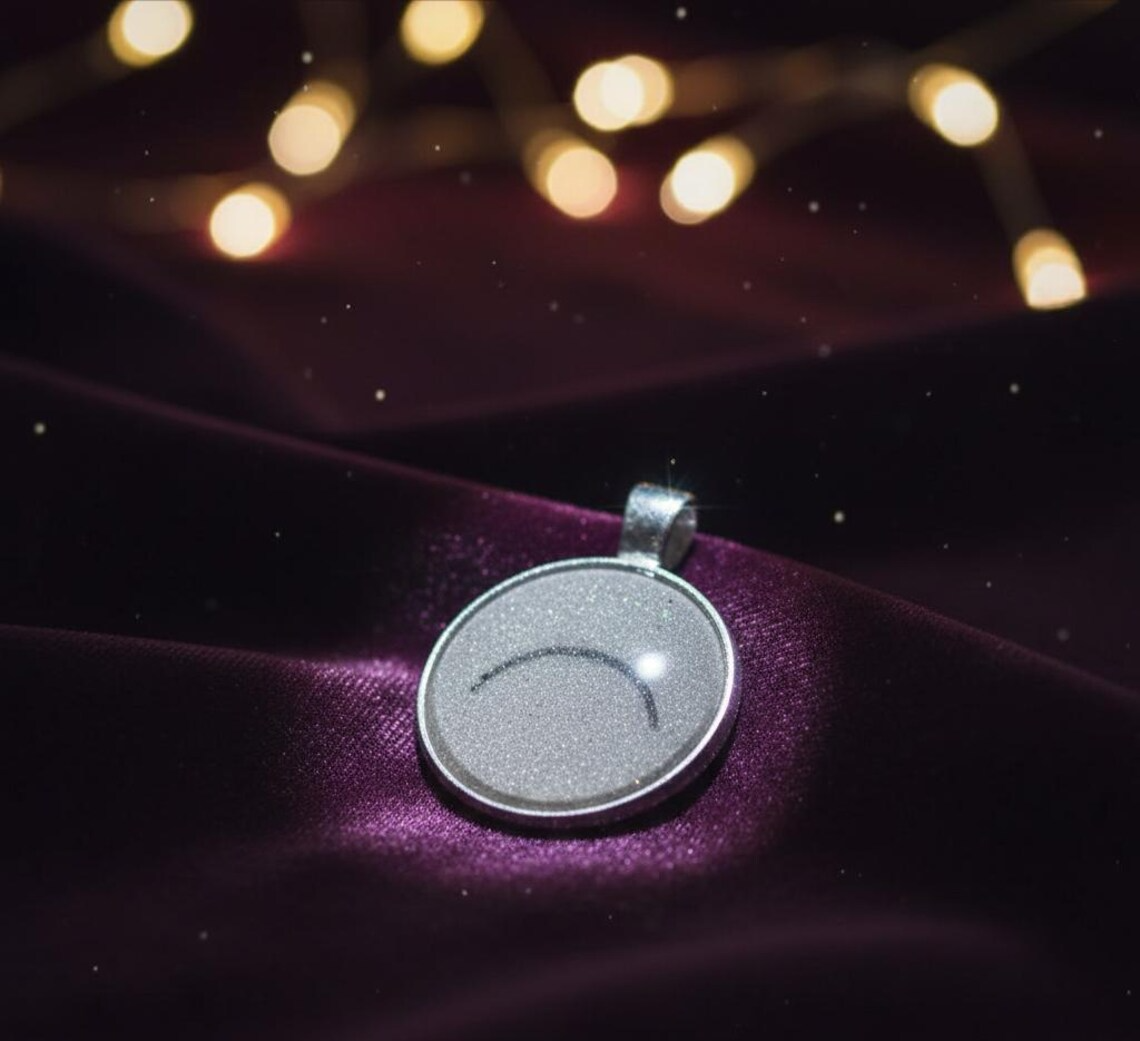 This handmade resin pendant features a clean, minimalist half-circle symbol carefully illustrated on the surface and sealed beneath a glossy finish. The soft curve of the design pairs beautifully with the resin’s shine, creating a modern, meaningful piece that’s both artistic and symbolic. Each pendant is hand-poured and unique, making it a beautiful choice for intentional jewelry, gifting, or everyday style.