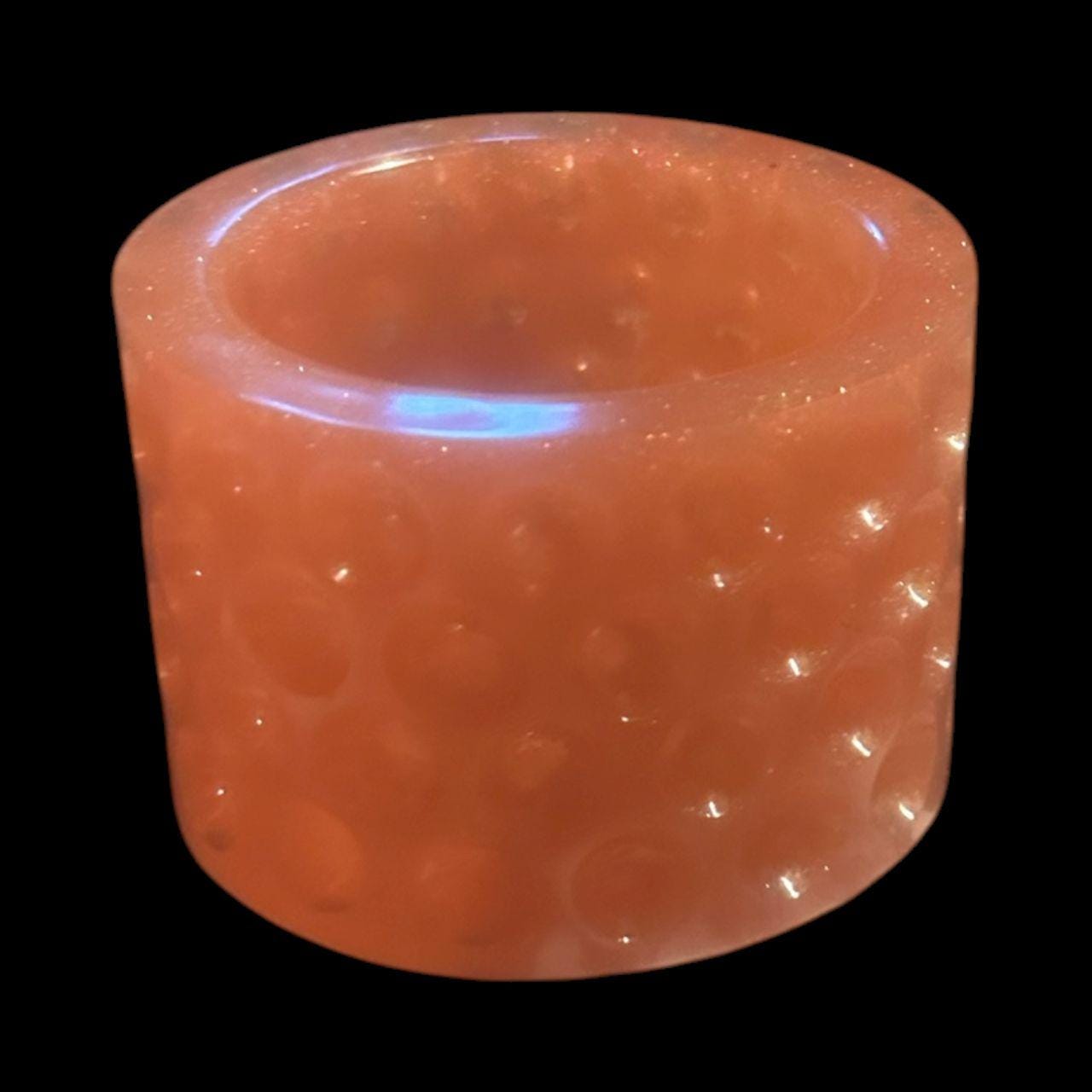 Add a pop of vibrant color and playful texture to your space with this eye-catching handmade coral orange resin jar. Featuring stunning bubble texture with sparkling shimmer throughout, this versatile container brings joyful energy and practical organization to any room. The smooth cylindrical shape and bold coral hue make this piece equally beautiful holding makeup brushes on your vanity, displaying air plants on your desk, or organizing jewelry on your dresser.