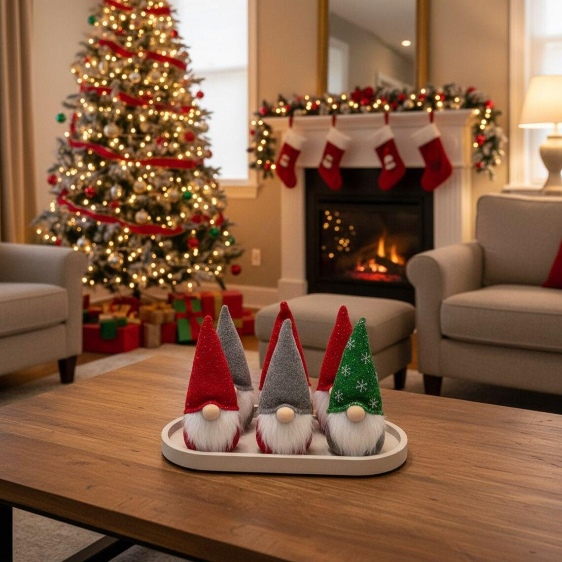 Arrange holiday decor like mini gnomes, ornaments, or pine cones
