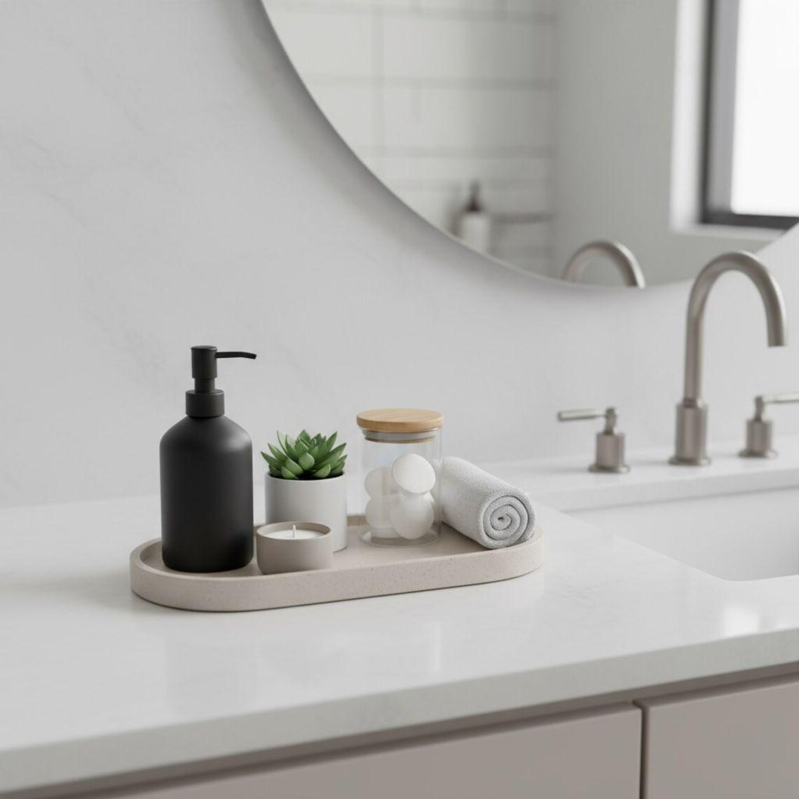 Create a spa-inspired sink area by placing this tray near your faucet with luxury soap bars, a small plant, and rolled hand towel. The neutral concrete adds organic texture while keeping daily essentials beautifully organized. Pair with white or marble countertops for stunning contrast, or layer with wood tones for warm farmhouse vibes.