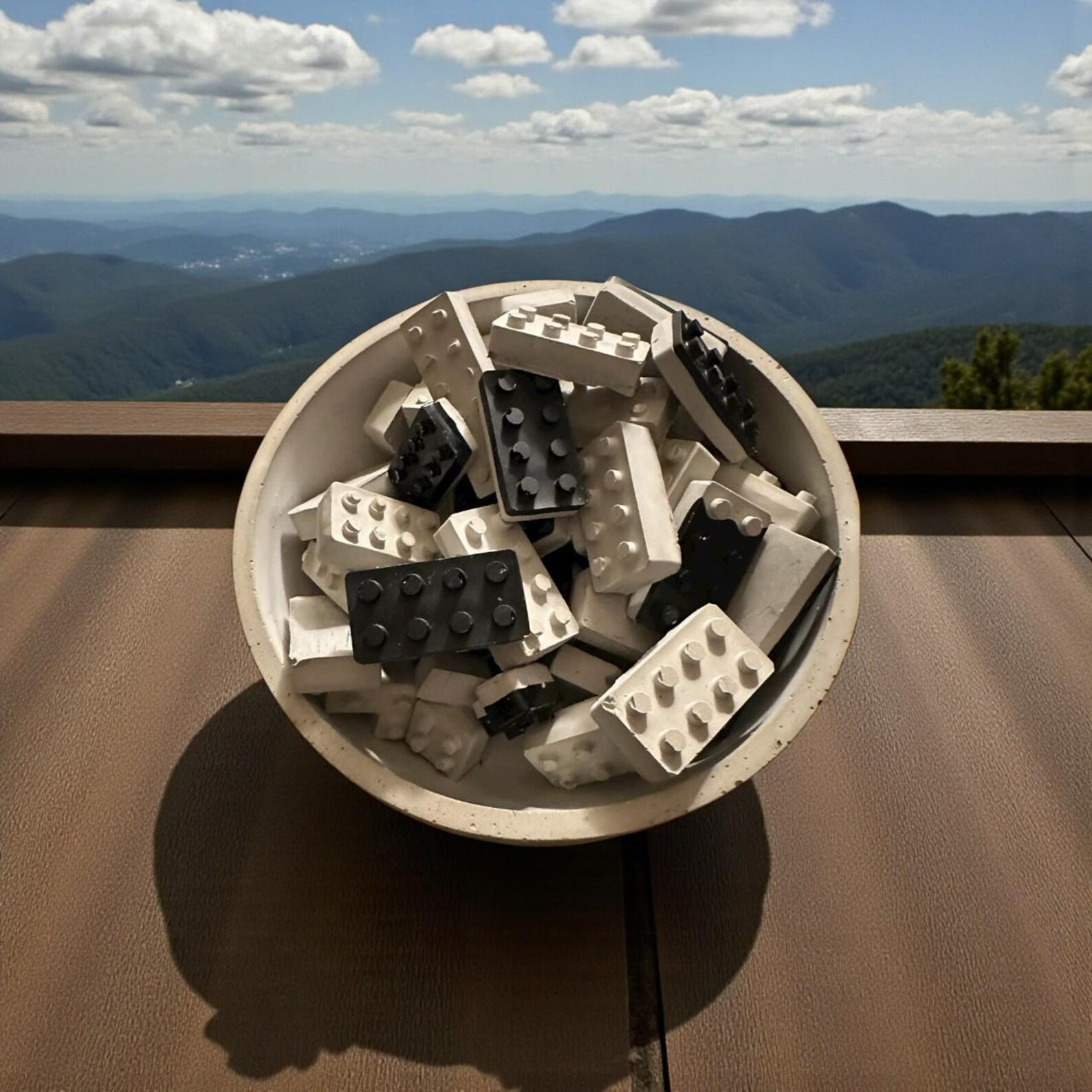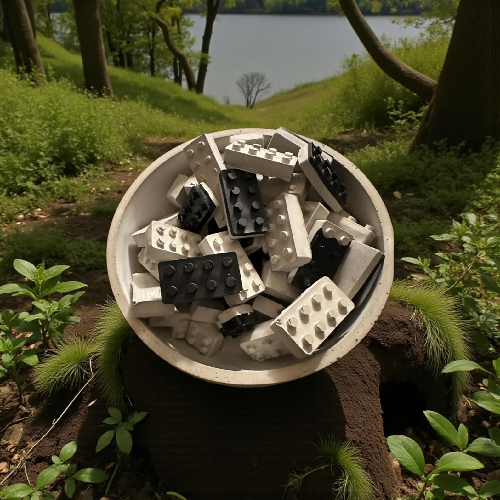Each block and bowl individually hand-cast and sealed. Natural concrete and resin variations include subtle color shifts, small air bubbles, mineral deposits, and unique surface patterns - signatures of authentic handmade artistry. White resin accents vary in pattern and coverage. Interlocking connections vary slightly as each block is hand-finished. Some blocks display different shades of cream, gray, or black. Bowl has organic shape variations and unique concrete patterns. These prove genuine handcrafted quality. Each piece sealed by hand with safety attention. Your curated collection contains handmade variety. This is authentic artisan work, not mass production.