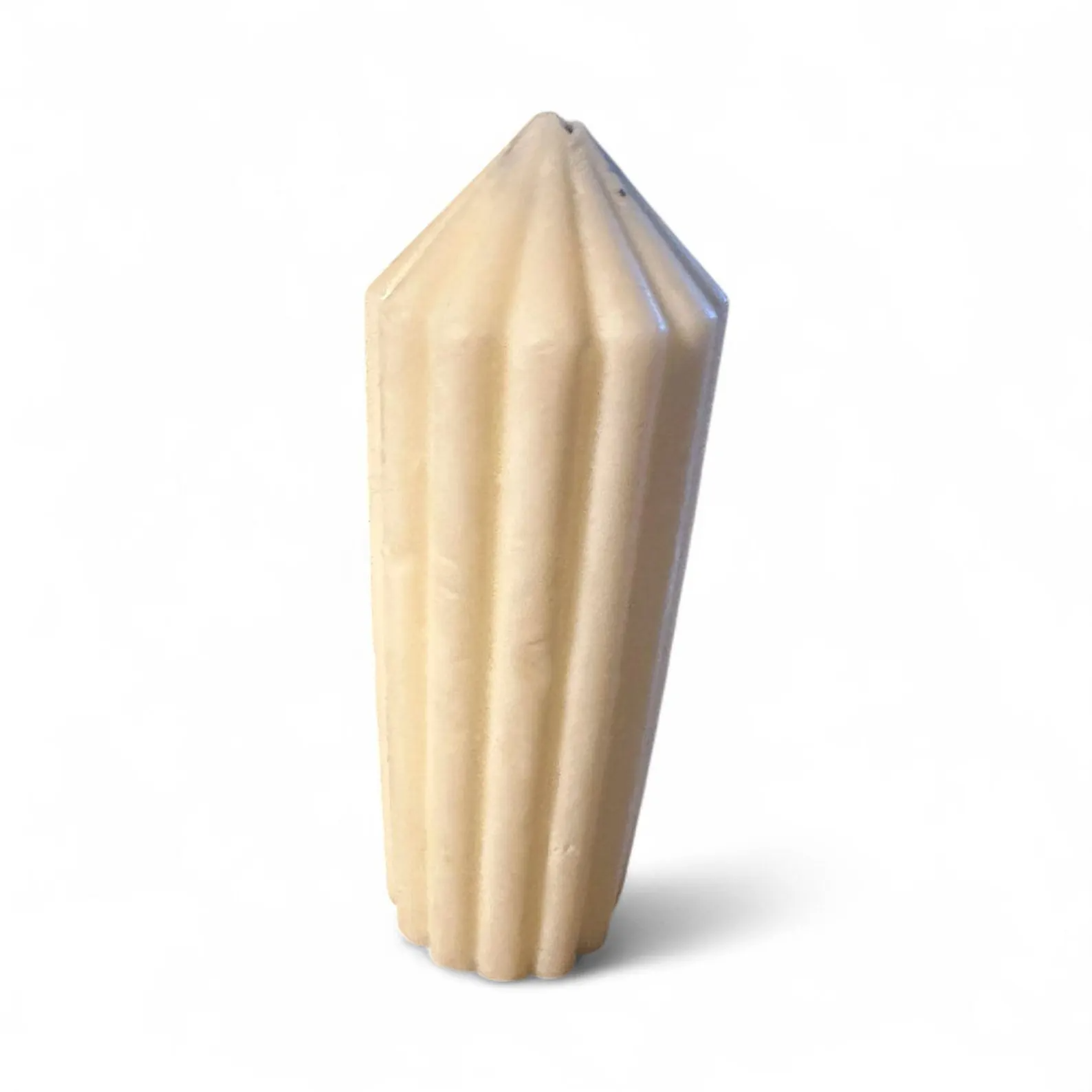 Bring architectural elegance to your space with this stunning handmade crystal tower candle! Crafted from premium natural soy wax, this geometric masterpiece features vertical faceted ridges that mimic the structure of natural quartz crystals. The elongated tower silhouette creates dramatic vertical interest while the angular facets catch and reflect light beautifully. Wrapped in sustainable kraft paper with a charming jute twine bow, this candle arrives gift-ready with eco-conscious packaging that's as thoughtful as the product itself. Whether displayed on shelves, desks, or mantels, this artisan candle doubles as functional light and contemporary art.