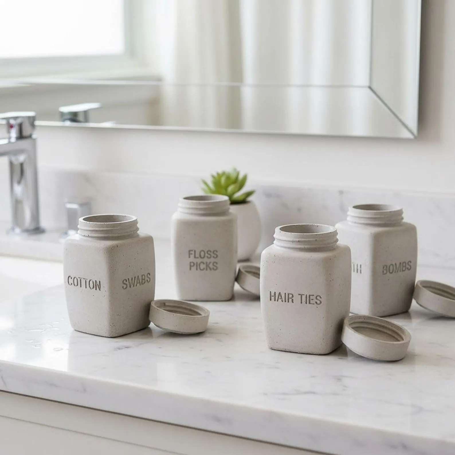 Transform bathroom counter into luxury spa by displaying these jars filled with cotton balls, bath salts, or homemade scrubs. The sealed concrete handles moisture beautifully without showing water spots or damage. Group with other natural materials like wood, marble, or plants for organic modern aesthetic. The tiered lid design adds architectural interest that elevates basic bathroom storage. Fill jars with Epsom salts in different scents or colors for pretty and practical display.