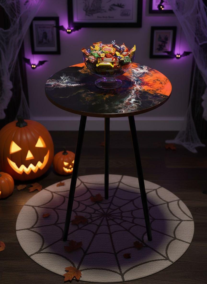 halloween table, resin table, orange black art, halloween decor, candy display, party centerpiece, modern table, spooky decor, abstract art table, functional art, halloween gift, statement piece, fluid art table