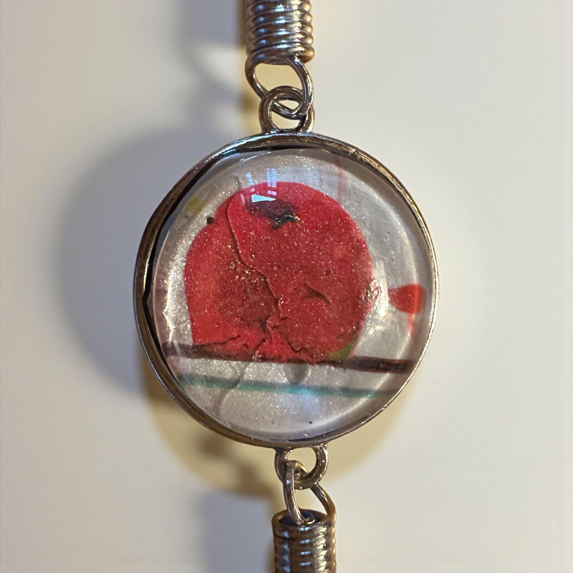 Handmade Red Cardinal Resin Charm Bracelet, Blue Fabric Wrap, Holiday Jewelry