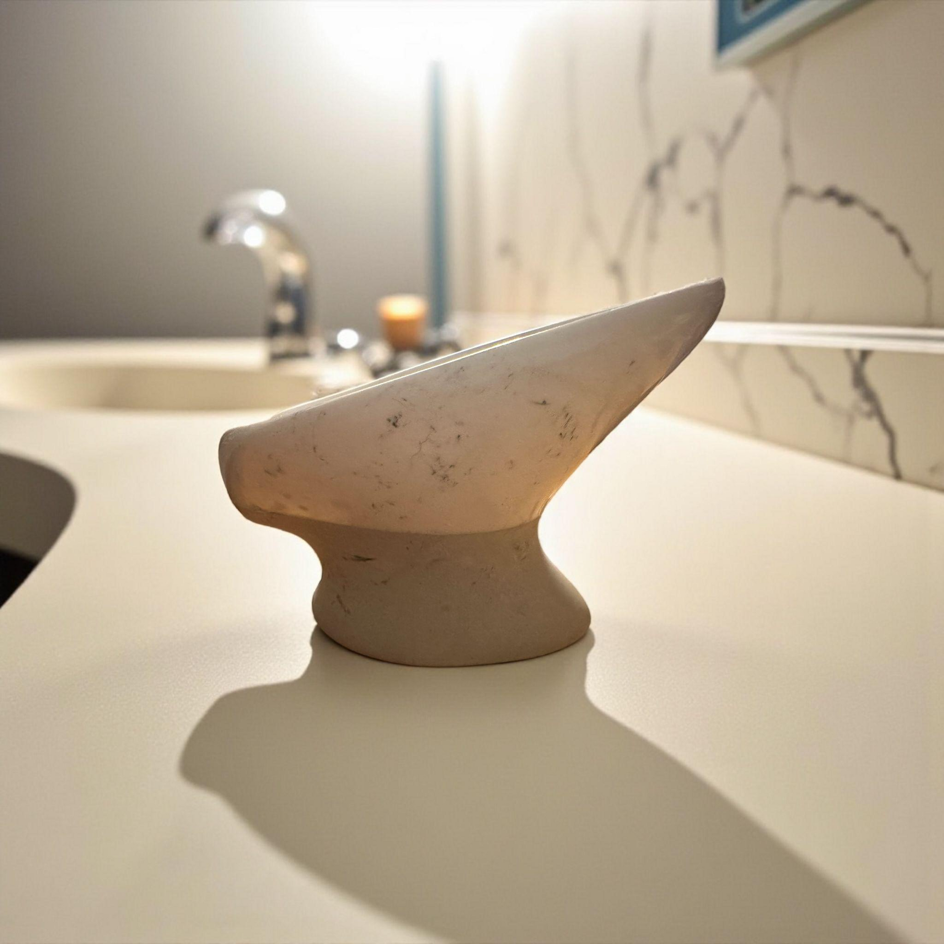 Transform your bathroom into a luxurious spa retreat with this stunning handmade soap dish that's equal parts functional accessory and sculptural art piece. Crafted from a beautiful fusion of resin and concrete with a sophisticated marble-like finish, this elevated soap dish features a unique tilted design that allows water to drain naturally, keeping your soap bars dry and long-lasting. The organic white coloring with natural variations creates an elegant marble aesthetic that elevates everyday routines into moments of luxury. The raised pedestal base keeps soap elevated above countertops, preventing messy soap residue buildup while adding a touch of modern sophistication to your bathroom, kitchen, or powder room.
