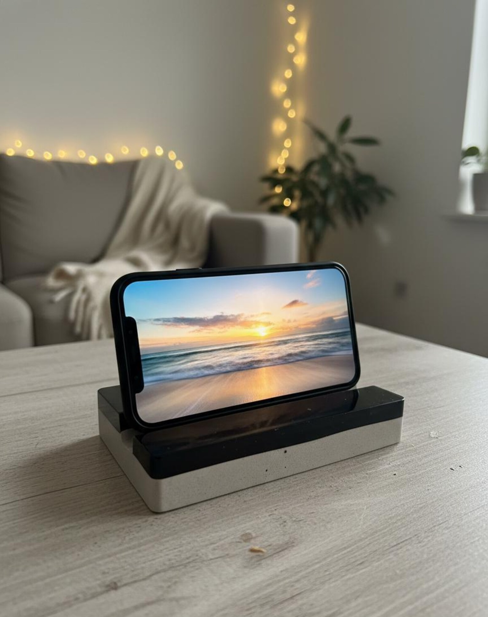 Every phone stand is individually hand-poured using artisan techniques and custom molds designed for optimal phone viewing angles. Natural variations in concrete texture, slight differences in resin gloss, tiny air bubbles, and unique surface patterns ensure no two stands are identical. The handmade process means some stands feature more pronounced concrete character while others showcase smoother finishes - these variations are hallmarks of authentic craftsmanship. Your stand's individual personality reflects hours of careful crafting and attention to functional design details that mass production cannot replicate.