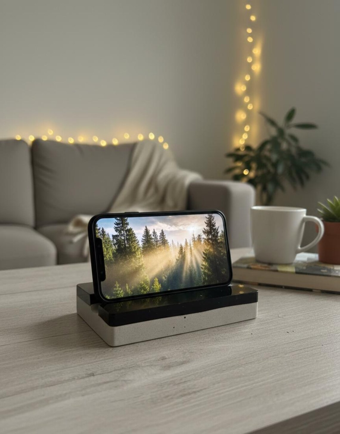 The combination of glossy resin and raw concrete creates the perfect marriage of sophistication and industrial authenticity for modern tech accessories. Black resin provides smooth protective surface that won't scratch devices while adding visual polish, and substantial concrete base delivers stability that lightweight plastic stands simply cannot match. This material pairing offers superior durability and longevity compared to cheap plastic or flimsy wire stands while providing contemporary aesthetic that elevates everyday tech accessories into decorative objects. The weight and texture combination ensures your phone stays exactly where you place it without constant repositioning.